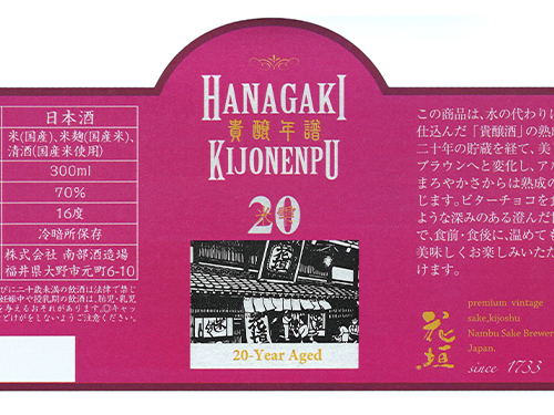 以酒取代釀造用水而釀造出來的「貴釀酒」熟成酒。經過20年的存放,色澤呈現美麗的深棕色,味道也變得更加圓潤醇香。猶如吃著黑巧克力,韻味深厚豐富,每一口都散發濃郁而清澈的甘甜。無論是餐前或餐後飲用都非常合適。
