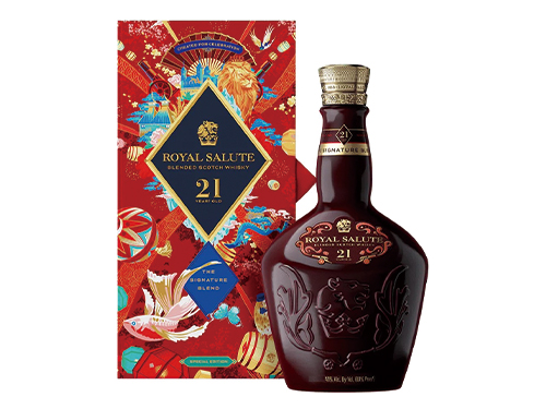 「金玉滿堂禮盒限定版」調和蘇格蘭威士忌有著充滿年節氣息的紅寶石瓶身;不僅是「皇家禮炮」二十一年的經典珍藏酒款,與節慶餐酒更是絕配!